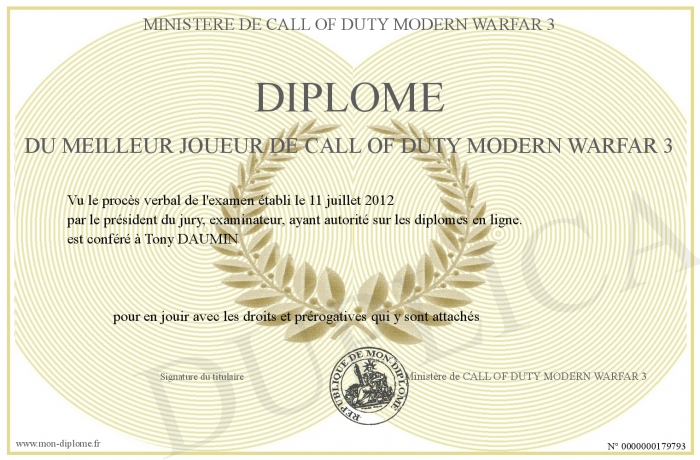 Envoyez par email votre Diplôme du meilleur joueur de call of duty modern warfar 3 personalisé