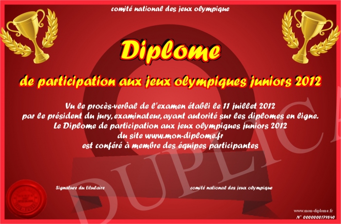 Envoyez par email votre Diplôme de participation aux jeux olympiques juniors 2012 personalisé
