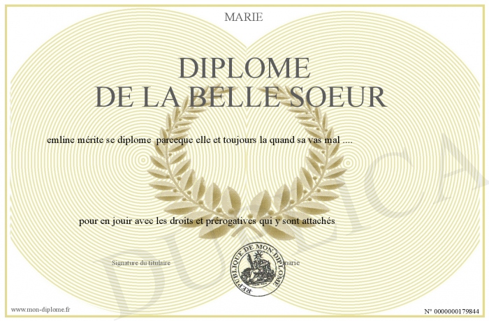 Envoyez par email votre Diplôme de la belle soeur personalisé