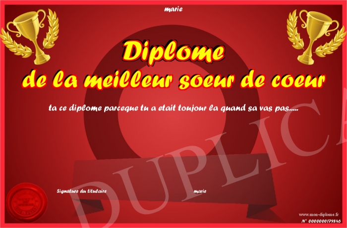Envoyez par email votre Diplôme de la meilleur soeur de coeur personalisé