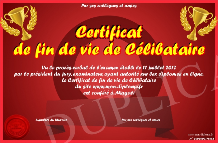 Envoyez par email votre Certificat de fin de vie de Célibataire personalisé
