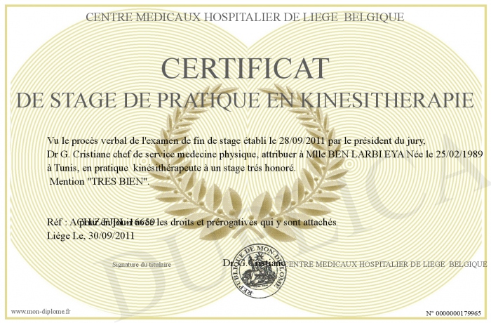 Envoyez par email votre Certificat de stage de pratique en kinesitherapie personalisé