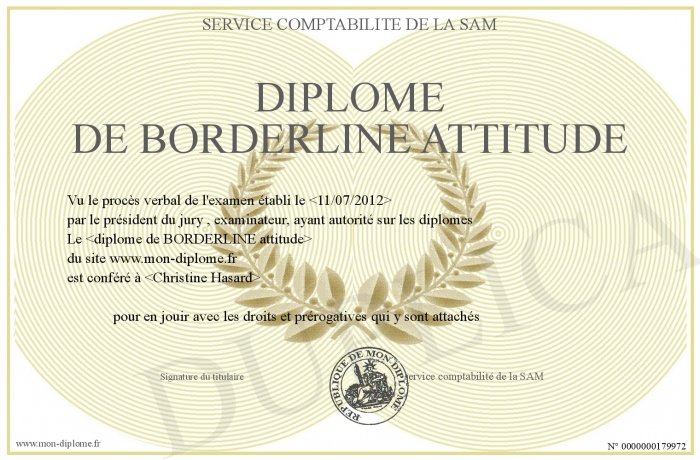 Envoyez par email votre Diplome de BORDERLINE ATTITUDE personalisé