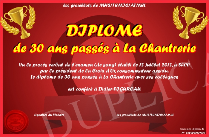 Envoyez par email votre DIPLOME de 30 ans passés à La Chantrerie personalisé