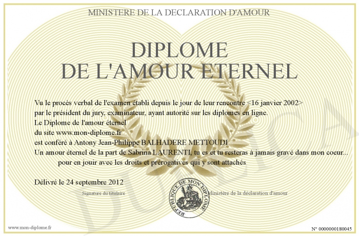 Envoyez par email votre Diplôme de l'amour éternel personalisé