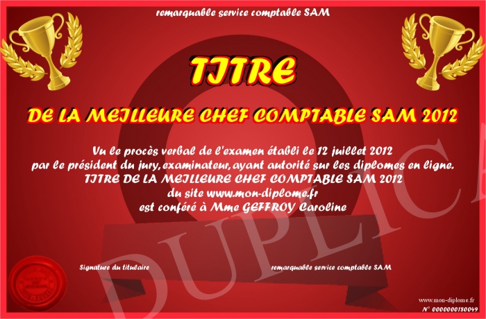 Envoyez par email votre TITRE DE LA MEILLEURE CHEF COMPTABLE SAM 2012 personalisé