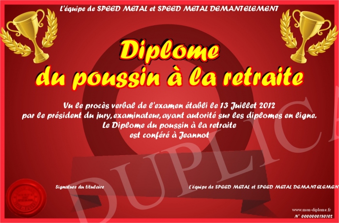 Envoyez par email votre Diplôme du poussin à la retraite personalisé