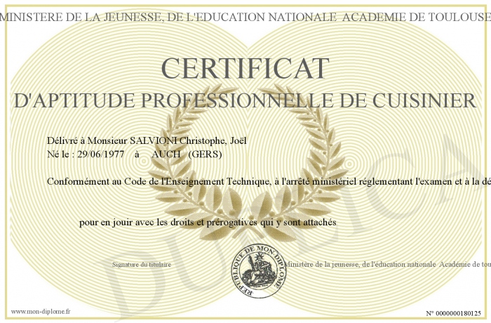Envoyez par email votre certificat d'aptitude professionnelle de cuisinier personalisé