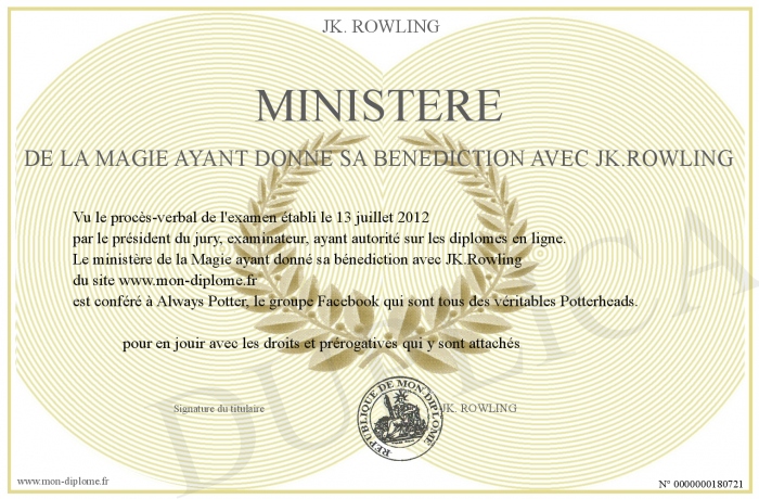 Envoyez par email votre ministère de la Magie ayant donné sa bénediction avec JK.Rowling personalisé