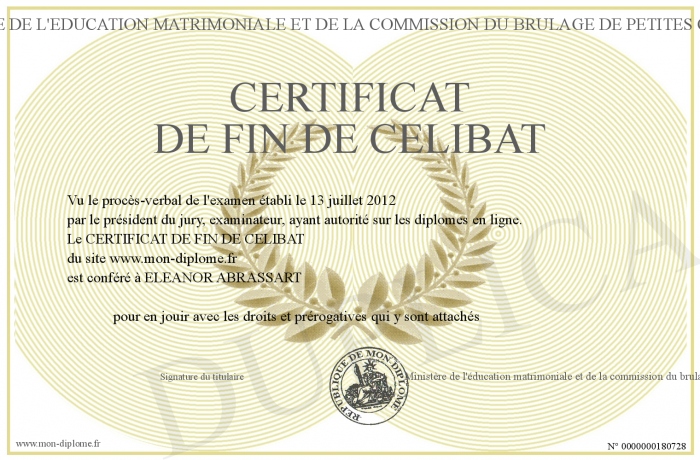 Envoyez par email votre CERTIFICAT DE FIN DE CELIBAT personalisé