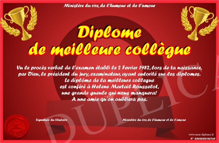 Envoyez par email votre Diplôme de meilleure collègue personalisé