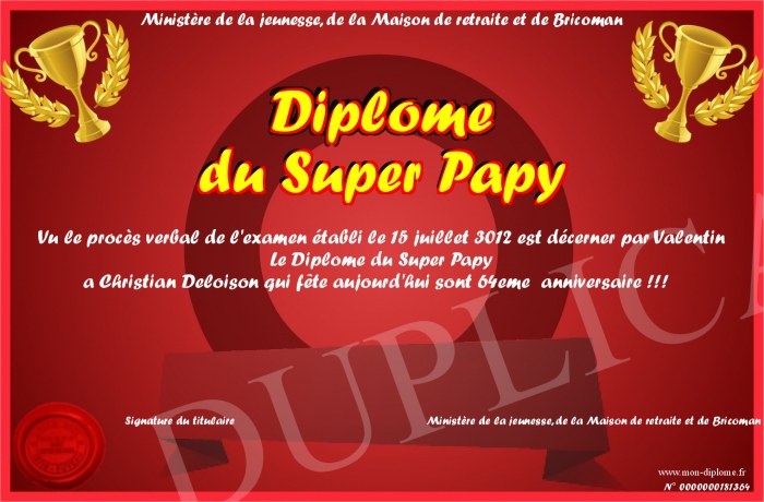 Envoyez par email votre Diplôme du Super Papy personalisé