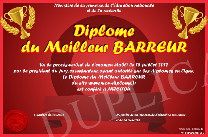 Envoyez par email votre Diplôme du Meilleur BARREUR personalisé