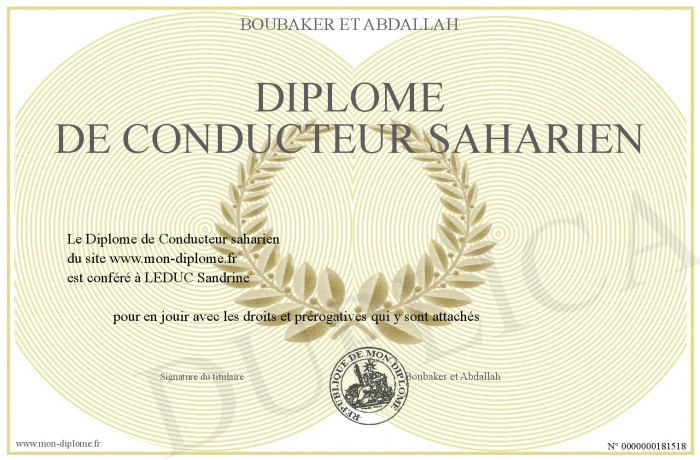 Envoyez par email votre Diplôme de Conducteur saharien personalisé
