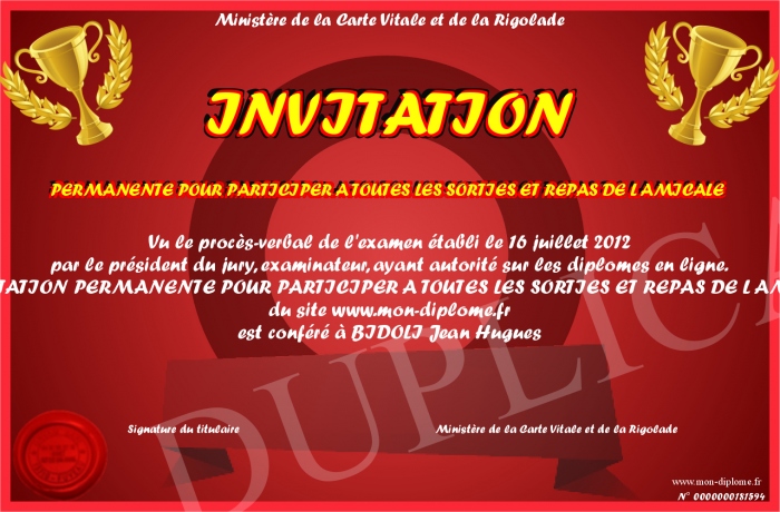 Envoyez par email votre INVITATION PERMANENTE POUR PARTICIPER A TOUTES LES SORTIES ET REPAS DE L AMICALE personalisé