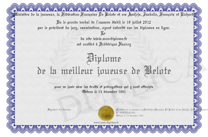 Envoyez par email votre Diplôme de la meilleur joueuse de Belote personalisé