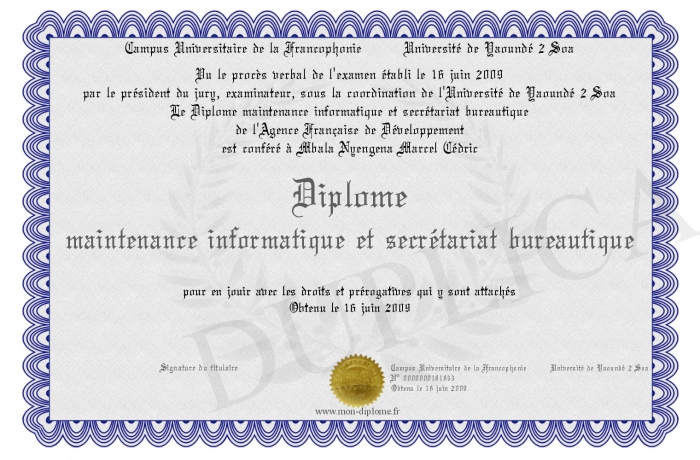 Envoyez par email votre Diplome maintenance informatique et secrétariat bureautique personalisé