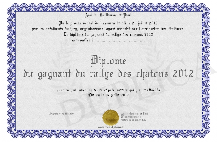 Envoyez par email votre Diplôme du gagnant du rallye des chatons 2012 personalisé
