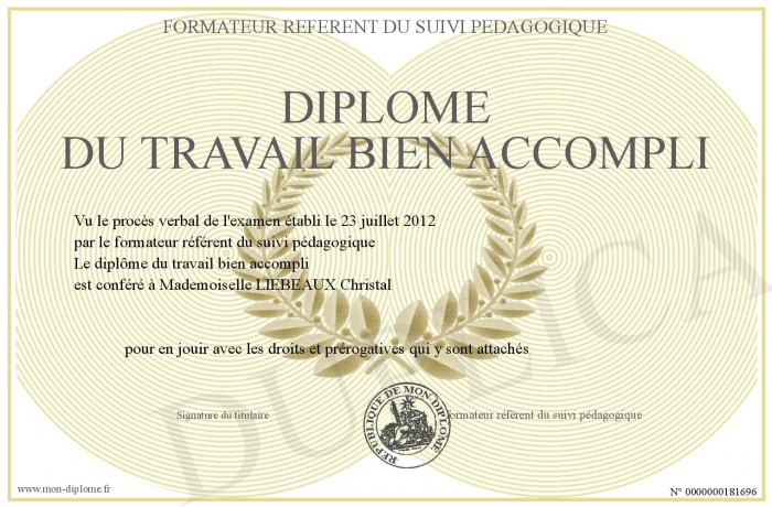 Envoyez par email votre Diplôme du travail bien accompli personalisé