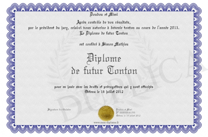 Envoyez par email votre Diplôme de futur Tonton personalisé