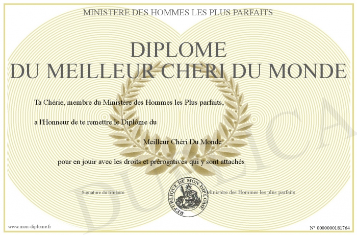 Envoyez par email votre Diplôme du meilleur Chéri du monde personalisé