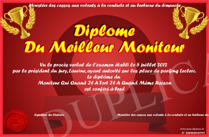 Envoyez par email votre Diplôme Du Meilleur Moniteur personalisé