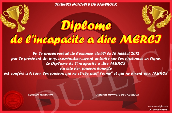 Envoyez par email votre Diplôme de l'incapacite a dire MERCI personalisé