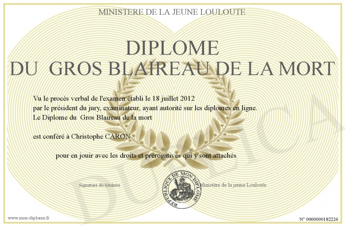 Envoyez par email votre Diplôme du Gros Blaireau de la mort personalisé