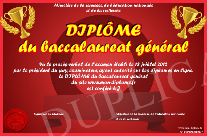 Envoyez par email votre DIPLÔME du baccalaureat général personalisé