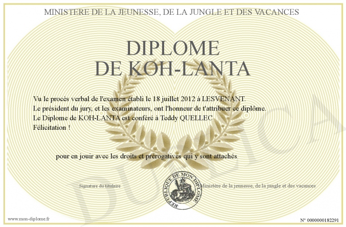 Envoyez par email votre Diplôme de KOH-LANTA personalisé