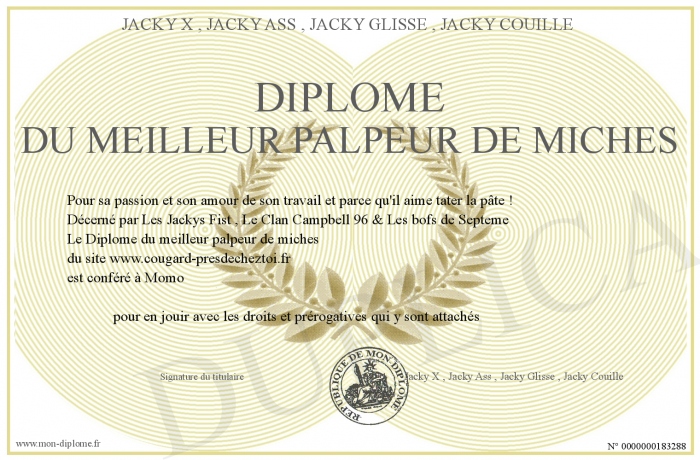 Envoyez par email votre Diplôme du meilleur palpeur de miches personalisé