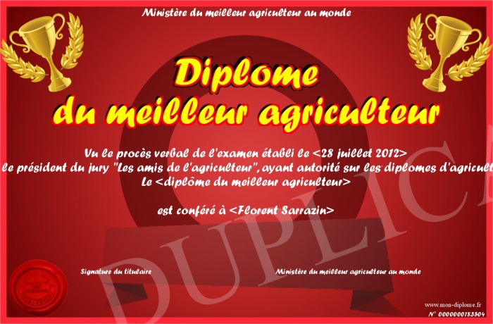 Envoyez par email votre Diplôme du meilleur agriculteur personalisé