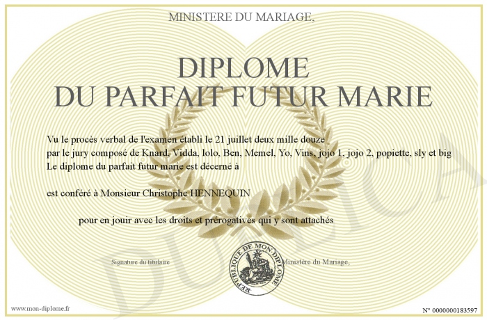 Envoyez par email votre Diplôme du parfait futur marie personalisé