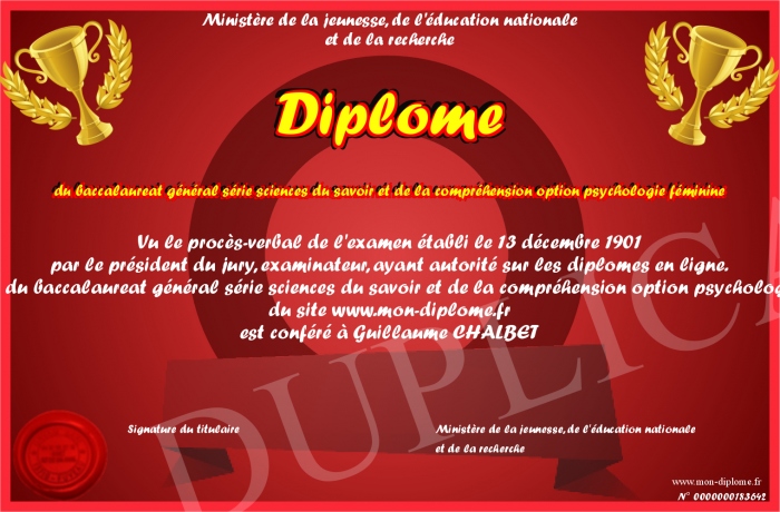 Envoyez par email votre Diplôme du baccalaureat général série sciences du savoir et de la compréhension option psychologie féminine personalisé