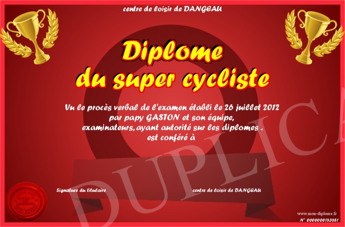 Envoyez par email votre Diplôme du super cycliste personalisé