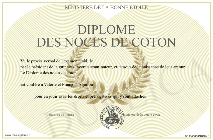 Envoyez par email votre Diplôme des noces de coton personalisé