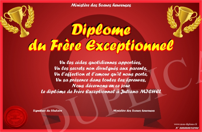 Envoyez par email votre Diplôme du Frère Exceptionnel personalisé