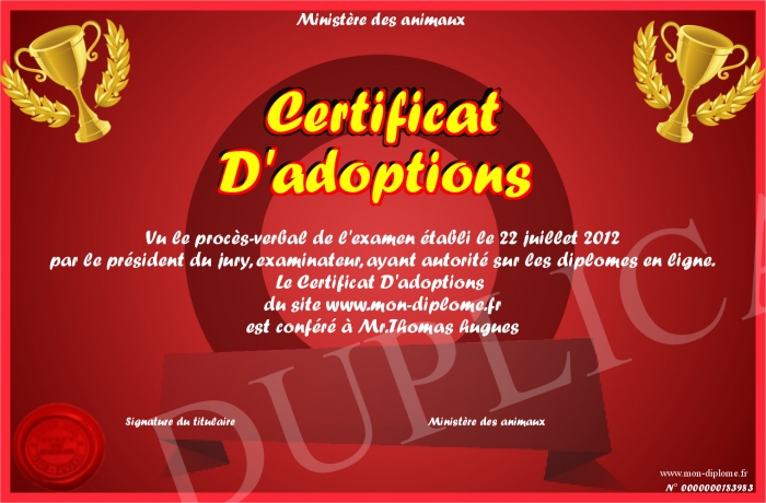 Envoyez par email votre Certificat D'adoptions personalisé