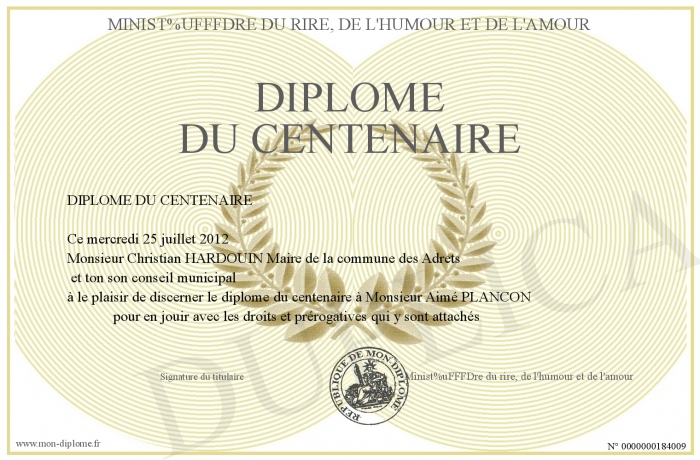 Envoyez par email votre Diplome DU CENTENAIRE personalisé