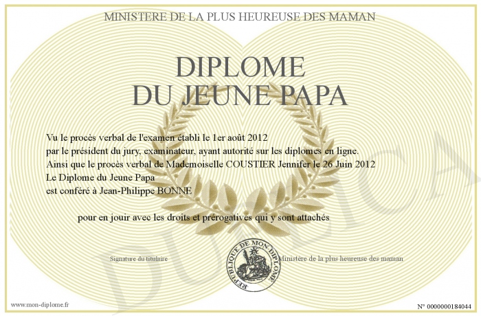 Envoyez par email votre Diplôme du Jeune Papa personalisé