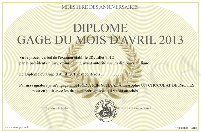 Envoyez par email votre Diplôme gage du mois d'avril 2013 personalisé