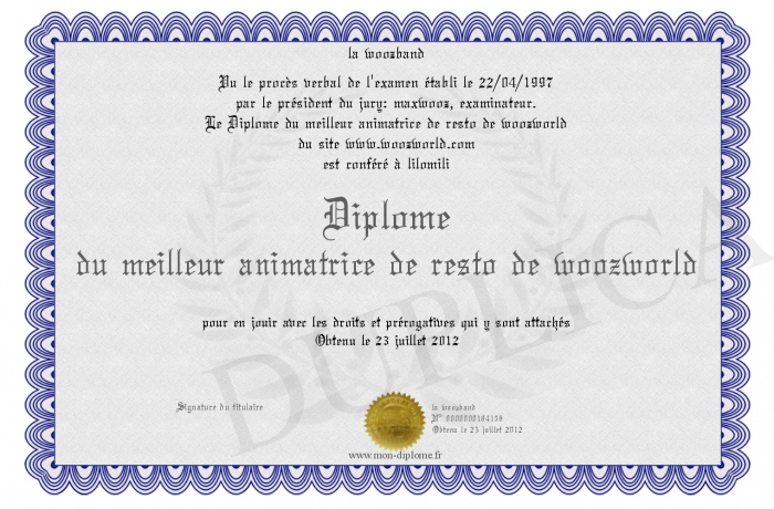 Envoyez par email votre Diplôme du meilleur animatrice de resto de woozworld personalisé