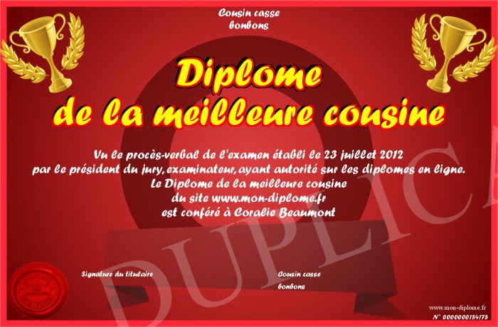 Envoyez par email votre Diplôme de la meilleure cousine personalisé