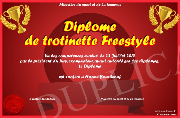 Envoyez par email votre Diplôme de trotinette Freestyle personalisé