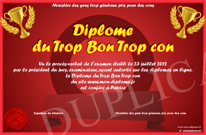 Envoyez par email votre Diplôme du Trop Bon Trop con personalisé