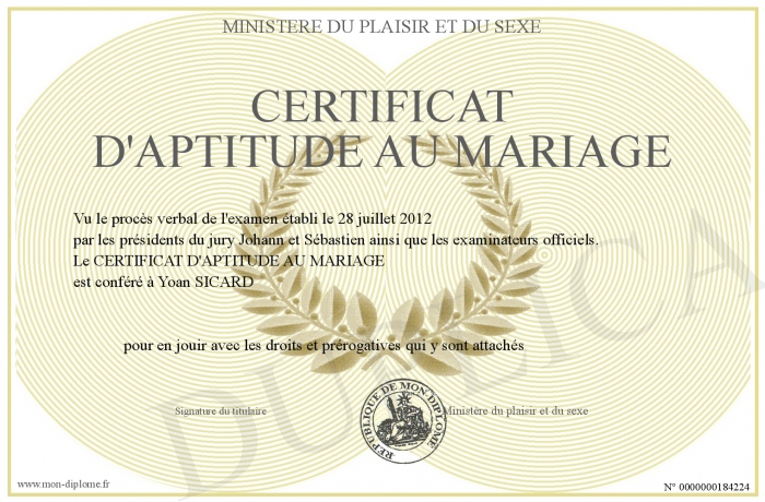 Envoyez par email votre CERTIFICAT D'APTITUDE AU MARIAGE personalisé