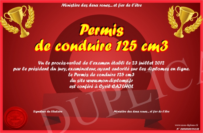 Envoyez par email votre Permis de conduire 125 cm3 personalisé