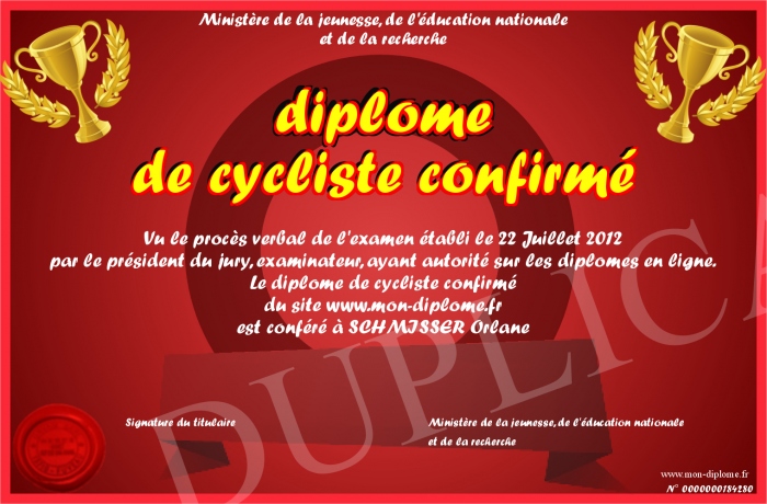Envoyez par email votre diplome de cycliste confirmé personalisé