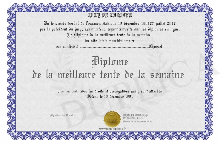 Envoyez par email votre Diplôme de la meilleure tente de la semaine personalisé