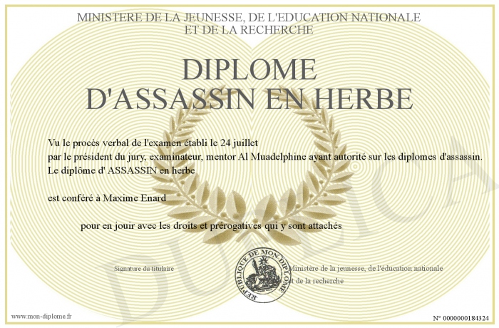 Envoyez par email votre Diplôme d'Assassin en Herbe personalisé